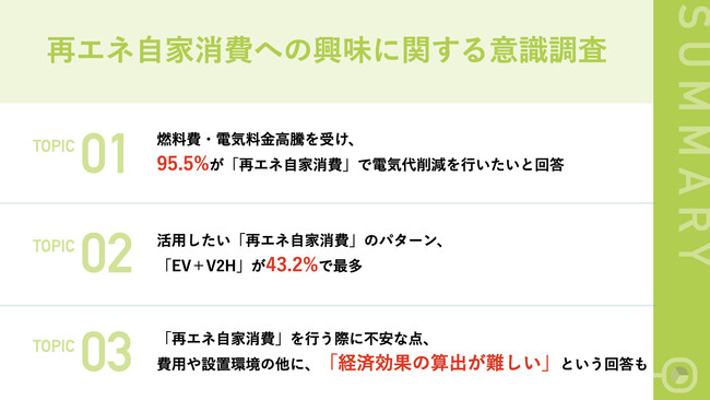 [独自レポートVol.3]電気代高騰受け、EV購入検討者の95.5%が「再エネ自家消費」での電気代削減に意欲 検討する活用パターンは「EV+V2H」が最多 一方で費用以外に「経済効果の算出」を不安視