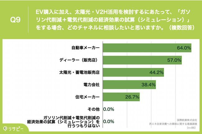 Q2(EV購入を検討するにあたり、ガソリン代削減の試算をしたか)で「行った」「行っていないが、今後行う予定がある」かつQ7で「行った」「行っていないが、今後行う予定がある」と回答した方に、「Q9.EV購入に加え、太陽光・V2H活用を検討するにあたって、「ガソリン代削減+電気代削減の経済効果の試算(シミュレーション)」をする場合、どのチャネルに相談したいと思いますか。(複数回答)」(n=86)と質問したところ、「自動車メーカー」が64.0%、「ディーラー(販売店)」が57.0%、「太陽光・蓄電池販売店」が44.2%という回答となりました。