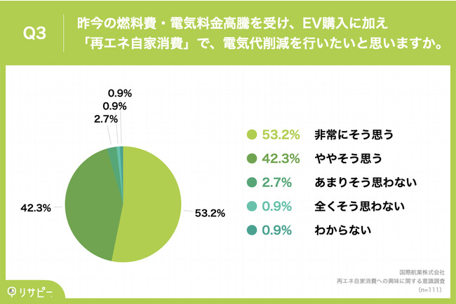 「Q3.昨今の燃料費・電気料金高騰を受け、EV購入に加え「再エネ自家消費」で、電気代削減を行いたいと思いますか。」(n=111)と質問したところ、「非常にそう思う」が53.2%、「ややそう思う」が42.3%という回答となりました。