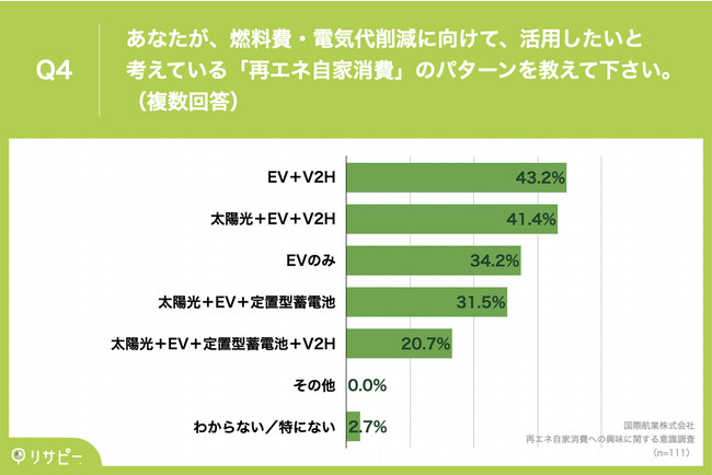 「Q4.あなたが、燃料費・電気代削減に向けて、活用したいと考えている「再エネ自家消費」のパターンを教えて下さい。(複数回答)」(n=111)と質問したところ、「EV+V2H」が43.2%、「太陽光+EV+V2H」が41.4%、「EVのみ」が34.2%という回答となりました。