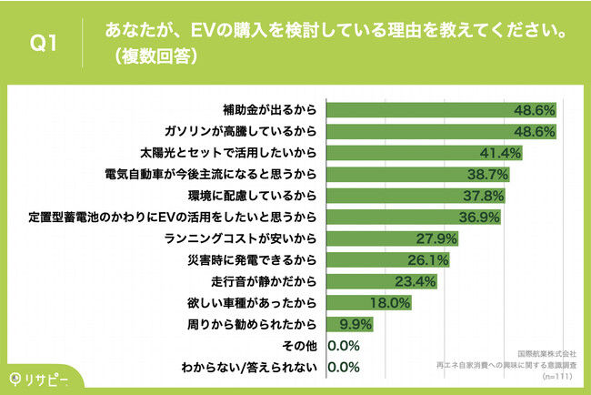 「Q1.あなたが、EVの購入を検討している理由を教えてください。(複数回答)」(n=111)と質問したところ、「補助金が出るから」が48.6%、「ガソリンが高騰しているから」が48.6%、「太陽光とセットで活用したいから」が41.4%という回答となりました。