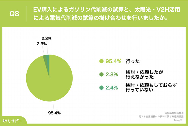 Q2(EV購入を検討するにあたり、ガソリン代削減の試算をしたか)で「行った」かつQ7で「行った」と回答した方に、「Q8.EV購入によるガソリン代削減の試算と、太陽光・V2H活用による電気代削減の試算の掛け合わせを行いましたか。」(n=43)と質問したところ、「行った」が95.4%、「検討・依頼したが行えなかった」が2.3%という回答となりました。