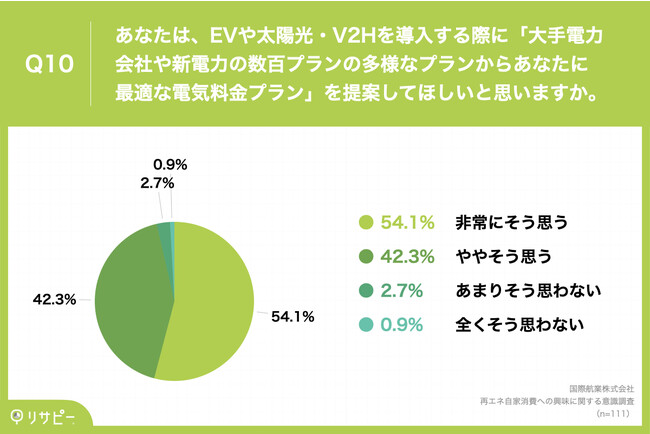 「Q10.あなたは、EVや太陽光・V2Hを導入する際に「大手電力会社や新電力の数百プランの多様なプランからあなたに最適な電気料金プラン」を提案してほしいと思いますか。」(n=111)と質問したところ、「非常にそう思う」が54.1%、「ややそう思う」が42.3%という回答となりました。