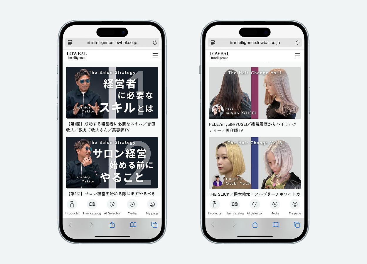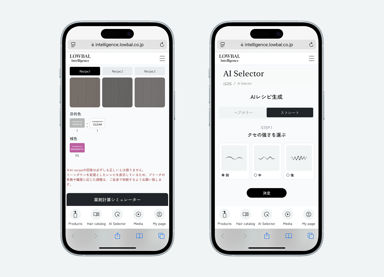 美容師様の業務効率化と生産性向上を目的に独自開発した、美容師専用AIプラットフォーム「LOWBAL Intelligence(TM)」では、美容師様および美容室経営者様を対象に、美容室の現場で活用できる多彩な機能を提供しています。AIによる薬剤レシピの自動生成(AI Selector)や、トレンドを網羅したヘアカタログ、販促POPのダウンロード機能などを提供。今回のリニューアルでは、新たに「ストレートレシピの自動生成機能」や「動画メディア」機能を追加し、美容師様の業務効率化と生産性向上を支援できる基盤へと進化しました。
