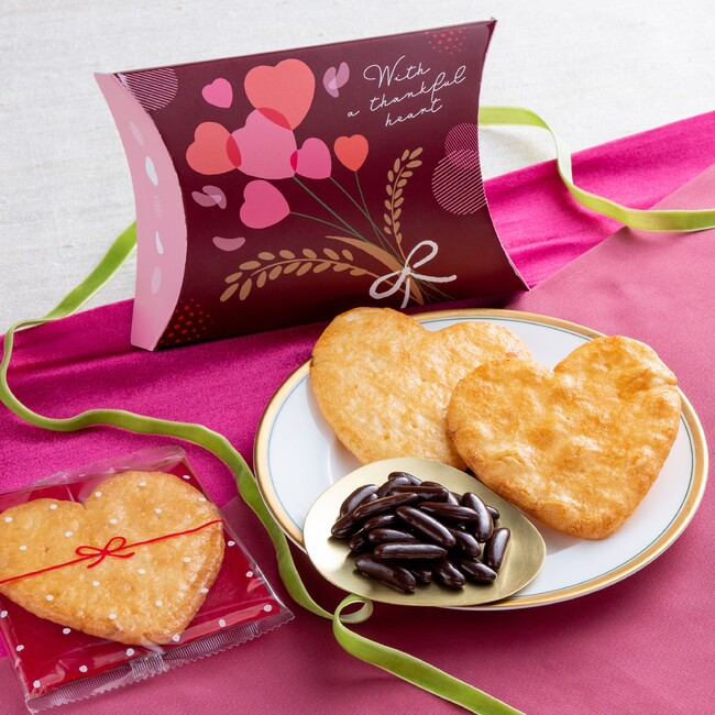 ハート型がかわいい醤油味のかた焼せんべいとビターなチョコがけ柿のたねの詰合せで、甘党にも辛党にも喜んでいただけます。お得な10個セットもおすすめです。