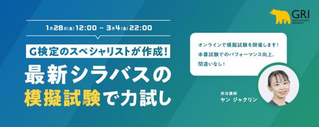 データ分析を専門とする株式会社GRI(本社:東京都港区、代表取締役上野勉、以下GRI)は、G検定(次回3/5開催)に向けて、オンラインで無料の模擬試験を開催します。模擬試験の問題は、本試験に近い、最新の出題傾向を反映した良問で構成しています。模擬試験で適度な緊張感のある「リハーサル」を行うことで、本試験での正解率の向上につながります。