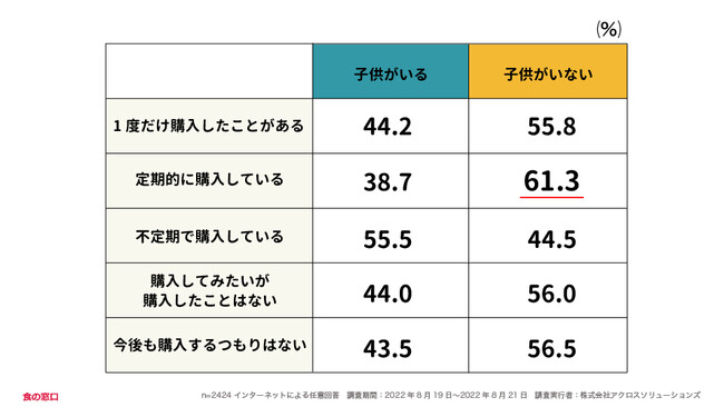 子供がいない人は肉の食品通販を定期的に購入している割合が一番多くなっていました。