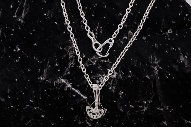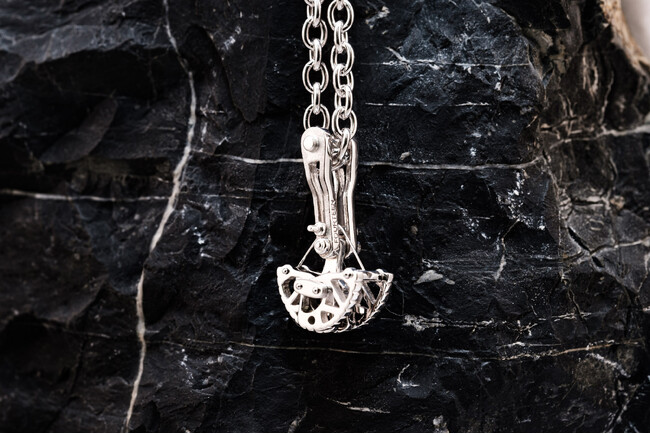 ユニセックス ペンダント 『MATE』は、クライミングギアとして使われるフレンズやキャメロットに代表されるカミングデバイスをモチーフしたネックレスで、実物と同様のアクションが可能な可動式ジュエリーです。バチカン部分は、エイトリングとカラビナをモチーフにし、クライミングギアとのセットがクライマーズアイデンティティを表現。パラコードとチェーンタイプの2点をご用意。