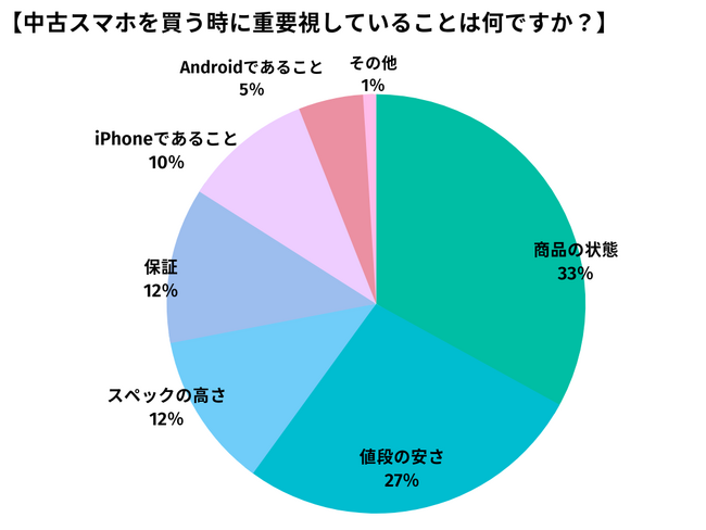 最も高い割合を示すのは「商品の状態」で33%となっており、中古スマートフォンを購入する消費者の中で最も重視される要素となっています。