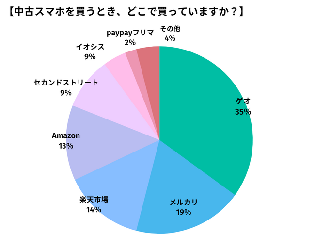 アンケート結果から、中古スマホの購入場所として「ゲオ」が最も多い35%であることがわかりました。
