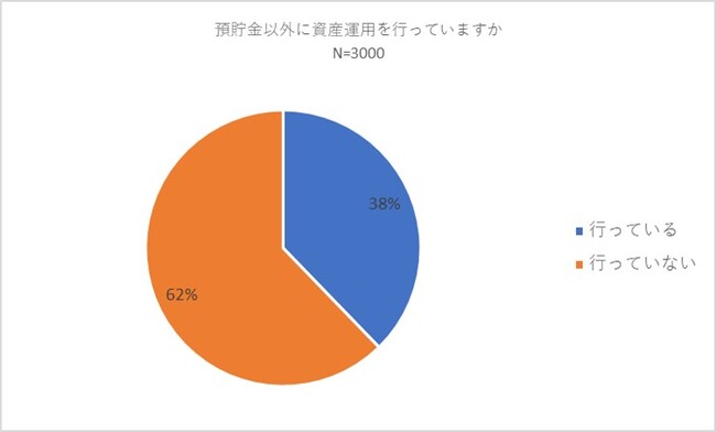 初めに全員に対して「預貯金以外に資産運用を行っていますか」との質問を行いました。その結果、38パーセントの方が資産運用を「行っている」、62パーセントの方が資産運用を「行っていない」と回答しました。