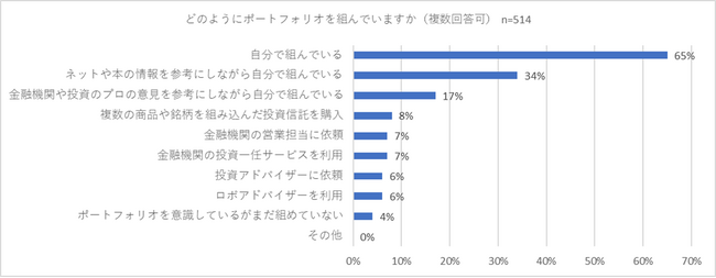 次に資産運用の際にポートフォリオを組むことを「意識している」と回答した514人に「どのようにポートフォリオを組んでいますか」と複数回答可で質問しました。その結果、「自分で組んでいる」が65パーセントでトップとなりました。以下、「ネットや本の情報を参考にしながら自分で組んでいる」(34パーセント)、「金融機関や投資のプロの意見を参考にしながら自分で組んでいる」(17パーセント)との回答が続きました。何らかの力を借りつつも基本的には自分でポートフォリオを組む方が多いことがわかりました。