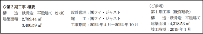 このたび竣工した第2期工事は、設計監理及び施工をヤマダホールディングスグループの株式会社ワイ・ジャスト様にお願いし、2021年5月12日付「中期経営計画の策定について」及び2021年5月21日付「『関東物流センター』第2期工事の再開及び首都圏物流網再構築に関するお知らせ」にて開示いたしました通り、既存の1棟に加え、2棟の倉庫を新設したものです。同センターでは、首都圏物流におけるストックヤード機能の中核として、首都圏全体を見据えた木材製品の保管を集約し、市場競争力及び収益力の強化を目指します。また、木材製品のアッセンブル機能などを新たに付加することで、プレカット工場等への広域配送における優位性を示すとともに、更なるサービスの向上を図ってまいります。