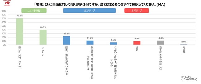 最後に、「地味」という言葉に対して抱く印象について調査したところ、既存のイメージである「目立たない、控えめ」が71.1%とトップでしたが、「堅実、地に足がついている」(23.2%)「影の主役、周り(他者)を活かす 引き立てる」(11.2%)と回答する人も一定数おり、「退屈」というネガティブなイメージの回答は9.9%と1割以下でした。「地味」という言葉がポジティブに捉えられていることがうかがえます。