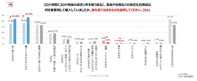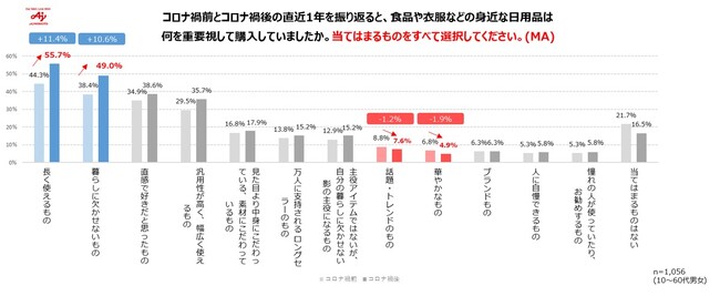 また、最も重要視していることについても、「長く使えるもの」「暮らしに欠かせないもの」がコロナ禍前からコロナ禍後では増加しており、「話題・トレンドのもの」「華やかなもの」は減少しているという同様の結果となりました。