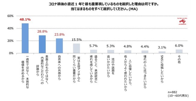 「2.コロナ禍後の直近1年にて、食品や衣服・小物類などを購入する際に最も重要視しているものを選択した理由」は「一過性ではなく、本質的な価値を求めるから」(48.1%)が最多となりました。そのほか、「表面上のものではなく、内面的なこだわりへの評価から」(28.8%)「自然体への共感から」(23.8%)と答える人も目立ちました。華やかなものより、長く使えるものや、暮らしにに欠かせないものを求める背景には、それらの本質的な価値を重要視し、評価することが、購入行動として定着しつつあるためと推察されます。