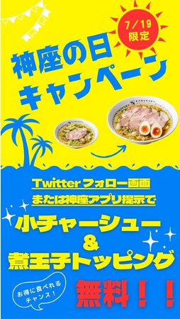 公式アプリリリースと同時に、7月19日(水)限定キャンペーンを実施致します。神座公式Twitterのフォロー画面または神座アプリアイコン提示で「小チャーシュー&煮玉子トッピング」無料キャンペーンを実施致します。