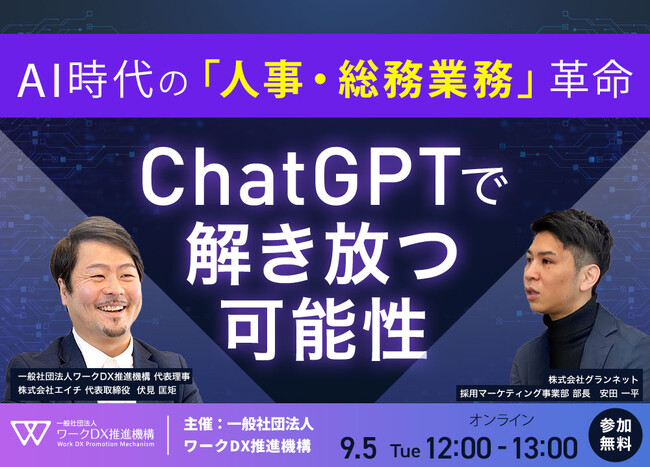 SEOコンサルティング等のデジタルマーケティングや採用代行サービスを提供している株式会社グランネット(本社:大阪府大阪市 代表取締役:山本 真俊)は、9月5日(火)12:00-13:00に一般社団法人 ワークDX推進機構(本社:東京都港区 代表理事:伏見 匡矩 高橋 恭介)と共催で「AIを活用した人事・総務業務」に関する無料ウェビナーを開催いたします。