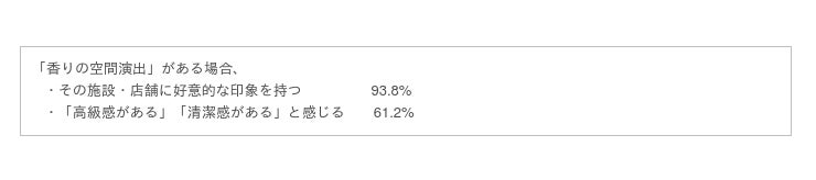 また、現在も世界中で甚大な影響をもたらしている新型コロナウイルス感染症(COVID-19)の流行下において天然アロマがもつ抗菌・抗ウイルス作用などの機能性に着目が集まり、空気環境改善を目的とした香りの演出も増加傾向にあります。調査では、このような「香りの空間演出」が施設・店舗に訪れる人に対して与える印象について明らかにしました。