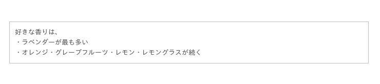 「好きな香り」については、安眠・リラックス効果が期待できる「ラベンダー」が最も多くなりました。そのほかには、年齢や性別を問わず広く親しまれやすい柑橘系の香りが上位を占めています。