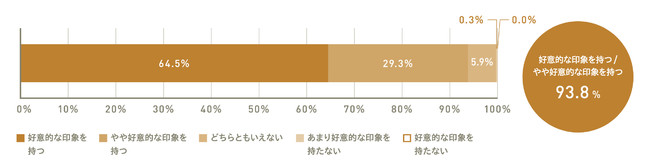 「香りの空間演出」が行われている施設・店舗への印象は、香りがない場合に比べて64.5%が「好意的な印象を持つ」、29.3%が「やや好意的な印象を持つ」と回答し、約9割が好印象を持つことが分かりました。具体的には、「高級感がある」「清潔感がある」と感じるとの回答が最も多く、同数となりました。