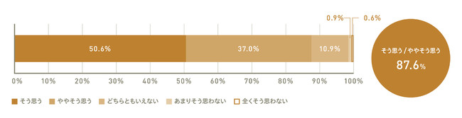「香りの空間演出」のある施設・店舗にまた行きたいと思うかという質問に対しては、50.6%が「そう思う」、37.0%が「ややそう思う」と回答しました。また、香りの空間演出を感じたことがある施設・店舗とのクロス集計を行ったところ、特に「フィットネスクラブ・ヨガスタジオ」「ショールーム・車ディーラー」で「そう思う」「ややそう思う」と回答した人が多くなりました。