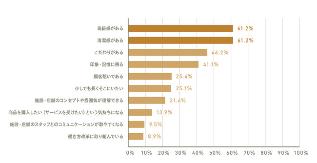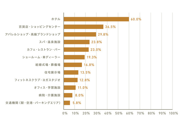 香りの空間演出を感じたことのある施設・店舗のなかで上位にあがった「ホテル」「百貨店」「高級ブランドショップ」のように空間のイメージにもこだわる施設・店舗においては、香りの空間演出を行うことで、訪れる人に対して上質な印象を与えるだけでなく、ブランディングやおもてなしの一環として香りが活用できるということが読み取れます。