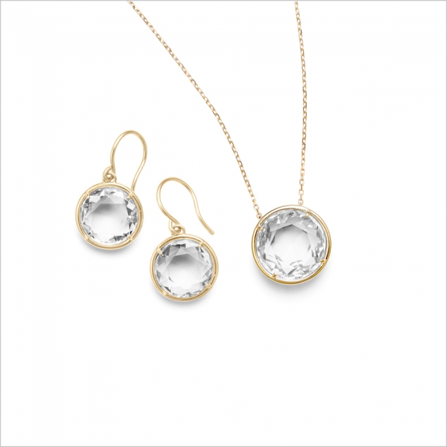 ロッククリスタルの表面に複雑なカット施し、キラキラした水滴のような輝きを表現した涼しげなジュエリー。透明感あふれる、夏のコーディネートにオススメなデザインです。