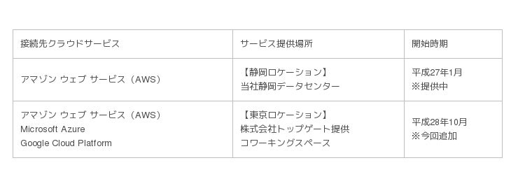 今回、このクラウド接続回線一時利用サービスにおいて、平成27年1月より提供している静岡ロケーションに加え、新たに東京ロケーションでの提供を開始いたします。これにより、対応するクラウドサービスをご利用中またはご利用をご検討中のより多くのお客様に、本サービスを提供してまいります。