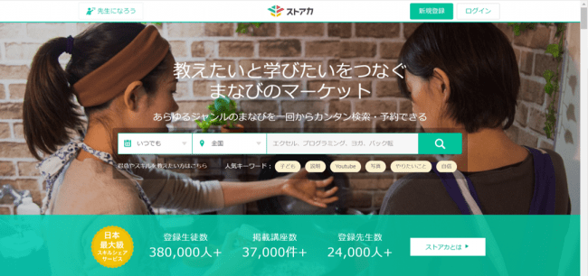 2012年7月設立。教えたいと学びたいをリアルにつなぐまなびのマーケット「ストアカ」を運営。登録会員数は38万人以上。ビジネススキルや自分磨き、趣味等全170ジャンルから学びたいことを選べます。誰でも先生になれ、スキルや好きを生かして講座を開く事ができます。ウェブ上でマッチング、リアル対面での講座開催が特徴です。先生登録者数は2万2000人を超えました。東京メトロや蔦屋書店、博多マルイなどの企業や商業施設とも協業している他、法人事業への展開も本格化させコースで選べる講師派遣プラン「オフィスクアソート」を開始しました。