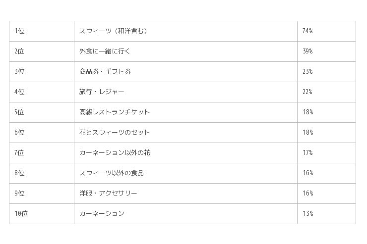 1位「スウィーツ」(74%)、2位「外食に行く」(39%)、3位「商品券・ギフト券」(23%)、4位「旅行・レジャー」(22%)、5位「高級レストランチケット」(18%)..... 10 位「カーネーション」(13%)