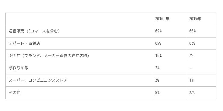 1位「通信販売(Eコマース含む)」69%、2位「デパート・百貨店」(65%)、3位路面店(16%)