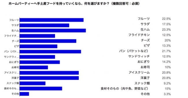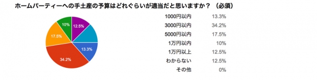 ちなみに、手土産の予算は3000円以内と答えた人が最も多く34.2%。家庭で楽しむホームパーティーだからこそ、お金をかけすぎずに楽しむという結果となりました。
