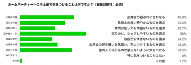 「気をつけること」の第1位は、50%の人があげた「取り分け、シェアしやすいものを選ぶ」。「ケーキを持って行ったが、切り分けるのに苦労した」「生花を持って行ったが、生ける手間を掛けてしまった」などの体験談もあり、主催者に負担をかけないアイテム選びを心がけているようです。2位以降は、「出席者の顔ぶれに合わせる」が40.8%。「他の人と同じものが被らないように気をつける」39.2%、「見栄えの良い華やかなものを選ぶ」34.2%という結果になりました。