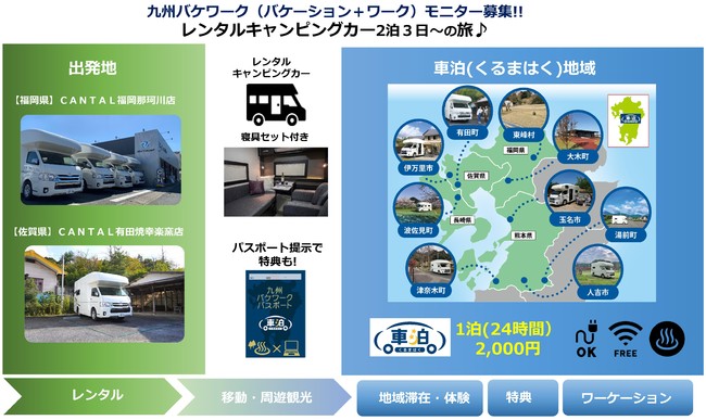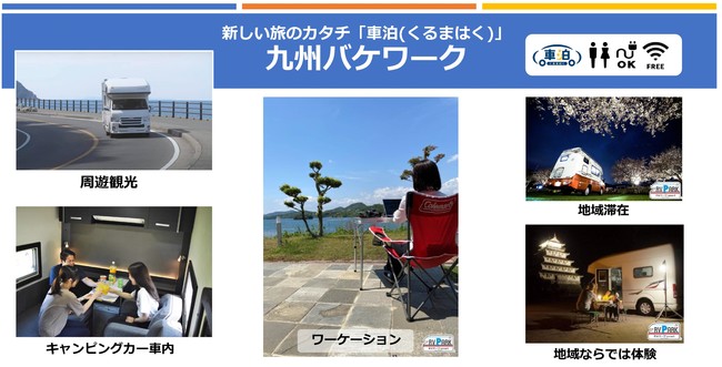 コロナ禍の休暇(バケーション)中に密のない自然豊かな地域、隠れた観光スポットなどを巡る周遊客に対し、車泊(くるまはく)による地域滞在と、プライベートな車内空間で仕事(テレワーク、オンライン会議など)も行える環境を提供する周遊型観光・ワーケーション『九州バケワーク』の有料モニターを募集しています。