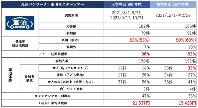 九州バケワークの実証実験としては、令和2年7月豪雨による熊本県南被災地の復興や観光振興を目的に、県南各地の不稼働時間帯の駐車スペース等を利活用し、車泊体験をするモニターツアーを実施しました。本モニターツアー(夏〜冬2回実施)により、With/Afterコロナにおける車泊に必要な設備ニーズや、導入に当たっての課題などを把握し、県南各地への車泊導入の可能性や、当該設備を活用した観光プラン及びキャンペーン、地域体験コンテンツ造成に向けた基礎データの収集を行いました。