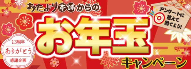 おたより本舗では13周年を記念して、特別企画「お年玉キャンペーン」を実施予定です。アンケート回答者の中から抽選で、1等「10万円分のギフト券・旅行券」など豪華賞品が計366名様に当たります。開催期間は2022年11月1日(火)〜2023年1月31日(火)。