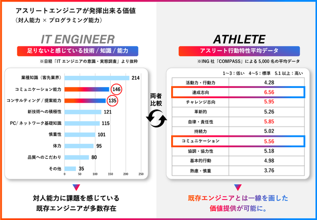 コミュニケーション能力や調整、提案能力に課題を感じているITエンジニアの方は少なくありません。(※添付アンケート調査より)エンジニアは個人作業に思われがちですが、プロジェクト単位でチームが組まれ、個人の技術力だけでなく、対人能力も作業効率、完成度に影響します。その点、アスリート人材は、競技を通じて、対人能力やPDCA習慣、人間関係構築力を学び、カテゴリは違えど、ビジネスにも活かす事が可能であり、今までのITエンジニアと違ったアプローチで業界貢献する事が可能となります。