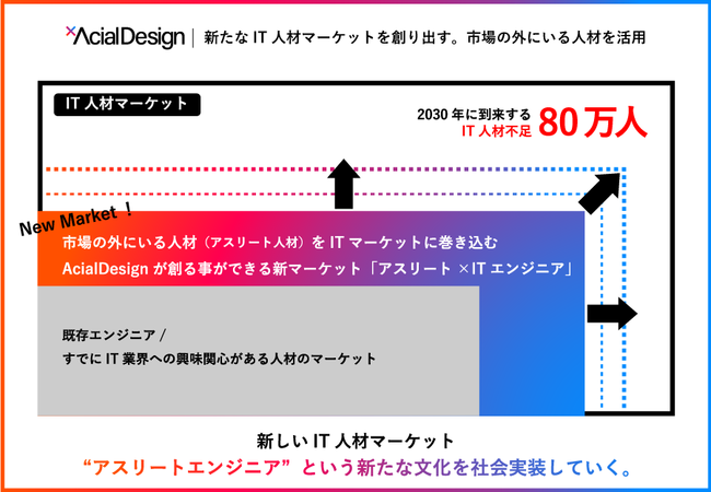 日本の重要社会課題の一つが「IT人材不足」であり、その数は「2030年に約80万人に到達する」試算が経済産業省より公開されている事は万人の知るところです。この社会課題に対して、当社は「市場の外にいる人材(アスリート人材)」をITマーケットに巻き込んでいく事によって、新たなエンジニア人材マーケットを創り出し、「アスリートエンジニア」という新たな文化を社会に実装していきます。