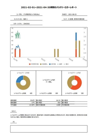 習得したバッテリー情報は、パソコンやスマートフォンで閲覧することができ、バッテリー異常時にはメール通知を受けることも可能です。BL-100の場合、バッテリーの短命化につながる過充電や長時間連続充電、長期間未充電、過放電、液不足などの各種アラートメールを受け取ることができます。また、クラウドに蓄積されたデータはレポートとして出力可能です。