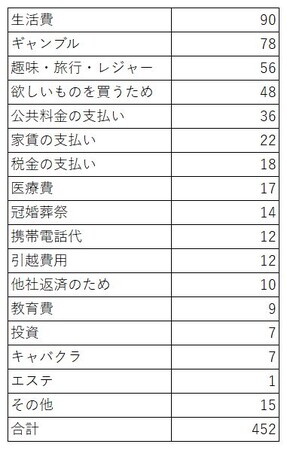 金融庁の「貸金業利用者に関する調査・研究」の調査結果でもローンの使い道の第1位は「生活費」、一般社団法人全国銀行協会の「銀行カードローンに関する消費者意識調査※2020年3月31日」でも「日常的な生活費の支出を補うため」が第1位になっていますが、本アンケート結果も使い道の第1位は「生活費」でした。