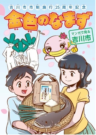 マンガにすることで手に取りやすく、吉川市を身近に感じてもらえるようにした他、おなじみの市イメージキャラクター「なまりん」と「吉川ねぎ夫」がナビゲーターとなり市の特産や偉人、文化財などを紹介していく賑やかで微笑ましい内容となっています。制作したマンガは、転入者等に配布している他、市内の公共施設・小中高等学校の図書室に配架しました。