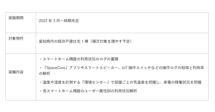 本実証実験は、愛知県内の既存戸建住宅において、アクセルラボが提供するスマートホームサービス「SpaceCore(スペース・コア)」のアプリやIoT機器を導入し、スマートホームの利用データを取得・解析することにより、お客さまの住まいや暮らしに役立つ新たなサービスの創造を目的としています。