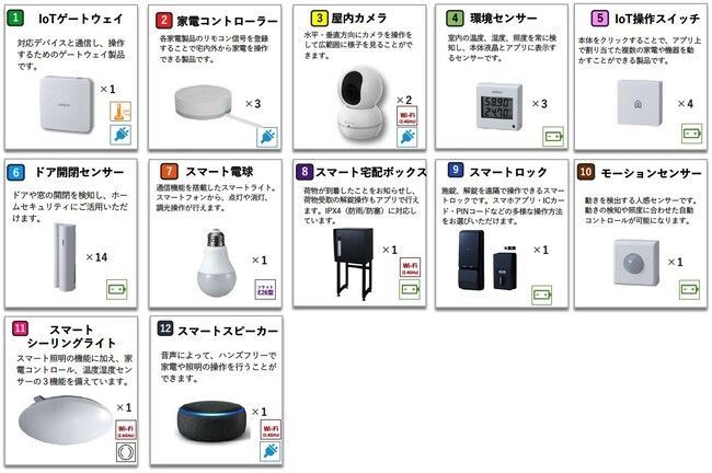 実証実験を行う、既存戸建住宅に導入した「SpaceCore」のスマートホーム機器は次の 12 種類です。なお、スマートスピーカーは「Amazon.com,inc」の「Echo Dot」であります。