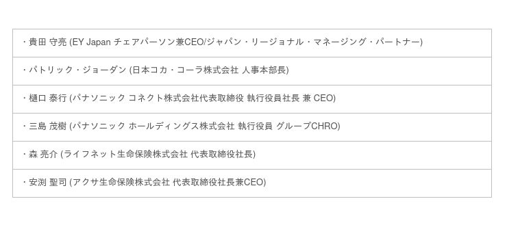 アクサ生命保険株式会社/アサヒグループホールディング株式会社/EY Japan/MSD株式会社/株式会社電通グループ/日本コカ・コーラ株式会社/パナソニック コネクト株式会社/パナソニック ホールディングス株式会社/富士通株式会社/三菱ケミカルグループ株式会社/ライフネット生命保険株式会社/ラッシュジャパン合同会社/ロバート・ウォルターズ・ジャパン株式会社