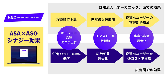 iOSユーザー向けの広告媒体の中で、唯一正しいユーザーデータが取れるのがASA広告です。この配信実績から得られたデータを活用し、自然流入数最大化施策である「ASO(アプリストア最適化の略)」を提案。これが「V.O.X」の大きな特徴であり強みとなっています。信頼できるデータに基づいた緻密な設計により高い効果を発揮します。