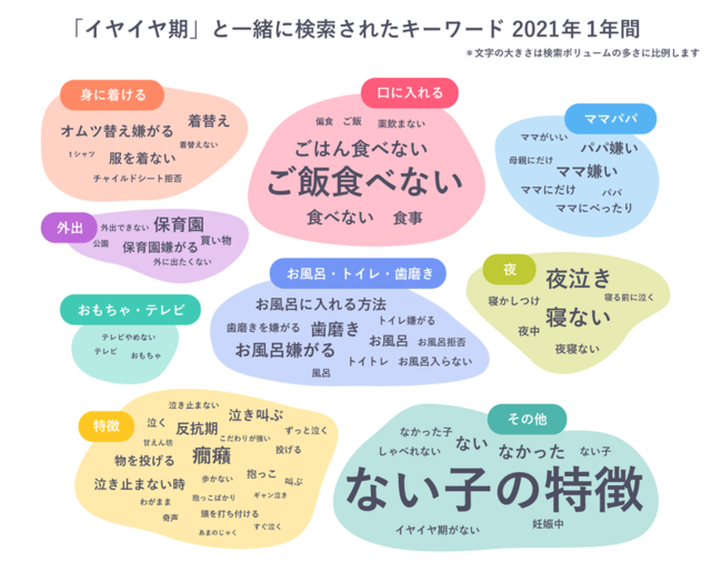 〜 ご飯、着替え、保育園、お風呂、歯磨き、寝る、など生活のあらゆるシーンの「イヤイヤ」が検索されている 〜