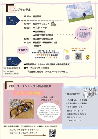 子育て真っ最中の先輩移住者、東京からテレワーク地方移住された先輩移住者に移住した経緯や移住後の暮らしを本音で語っていただきます!また、能美の里山地域で、自然の中で子どもたちと活動する団体に所属する先輩達もいらっしゃいます。