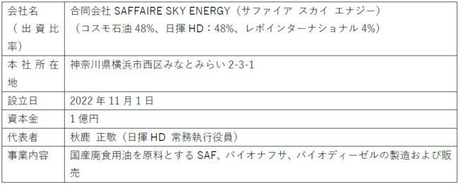コスモ石油株式会社(代表取締役社長:鈴木 康公、以下「コスモ石油」)、日揮ホールディングス株式会社(代表取締役会長CEO:佐藤 雅之、以下「日揮HD」)、株式会社レボインターナショナル(代表取締役:越川 哲也、以下「レボインターナショナル」)の3社は、廃食用油を原料とした国産SAF(Sustainable Aviation Fuel:持続可能な航空燃料)の製造や供給事業(以下「本事業」)を行うために、本年11月1日付で新会社「合同会社SAFFAIRE SKY ENERGY」を設立したことをお知らせします。