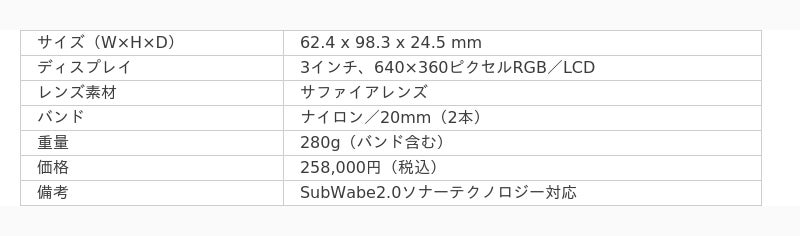 本体はキズのつきにくいサファイアレンズ、20ATM(20気圧)防水機能※、深度でのダイビングシーンでも確かな操作性と安定した機能性を持ち、深度ダイブを含むあらゆる環境で、テクニカルダイバーや職業ダイバーなどのダイブ中の情報提供と安全サポートを実現します。